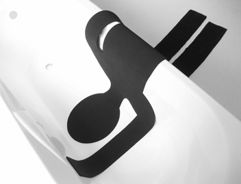 浴室の湯気が生み出す、温かく明るく、ぼんやりとした安心できる"FU-WA"な空間。そこに印象の全く違う直線的な黒い人影がいたら、 さらに"FU-WA"が際立つのではないかと思いこの作品を作りました。上半身の部分は特殊な木炭とポリエチレンのシートでできていて、 入浴時の滑り止めとして使え、また入浴後は浴室のカビの発生を防ぎます。下半身部分はタオル地でできていてバスマットとして使え、 また足が自由に動くので、動かし床を磨くことができます。 |